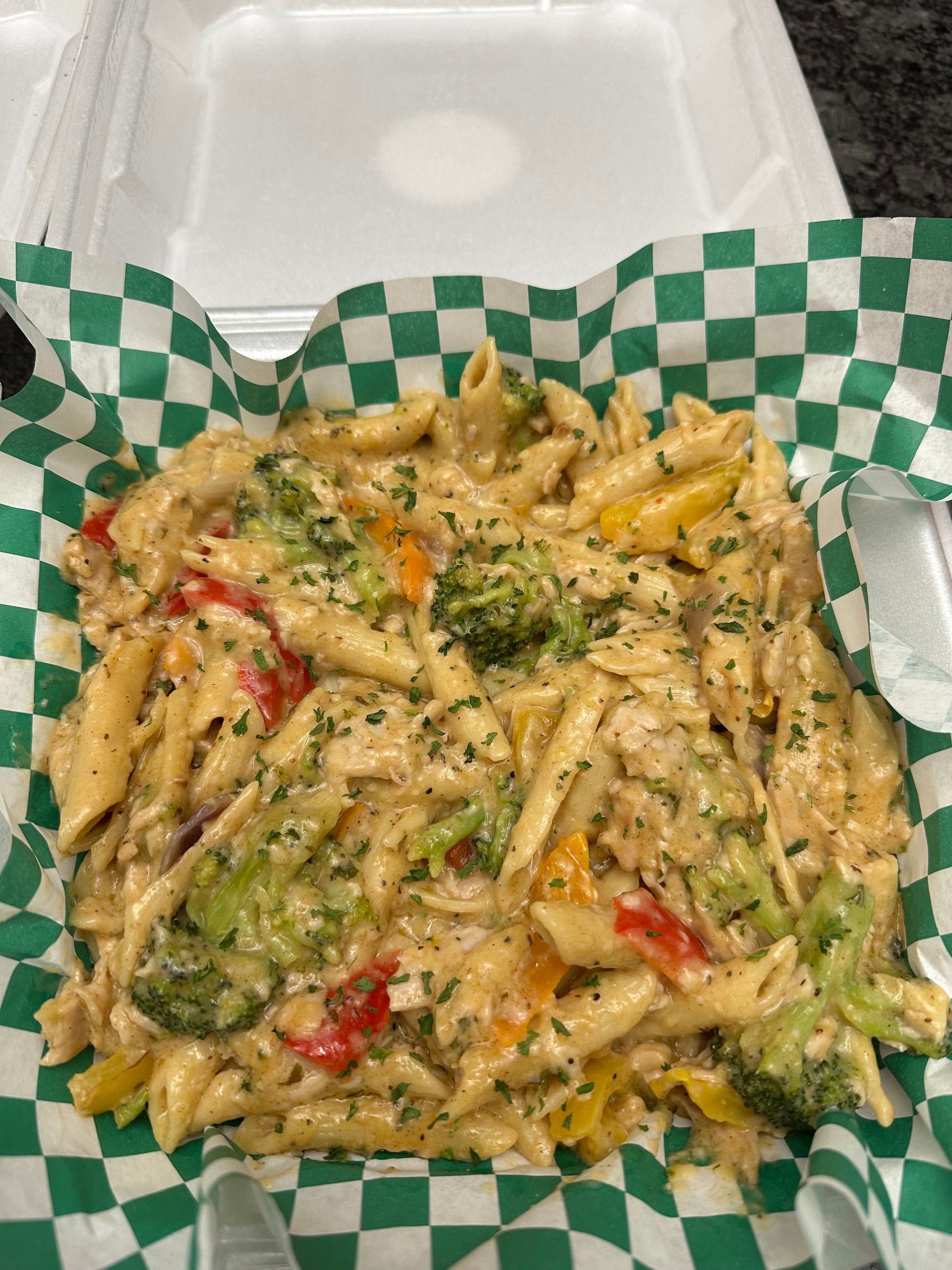 Cajun alfredo sauce, noodles, bell peppers, onions and vegan chk'n