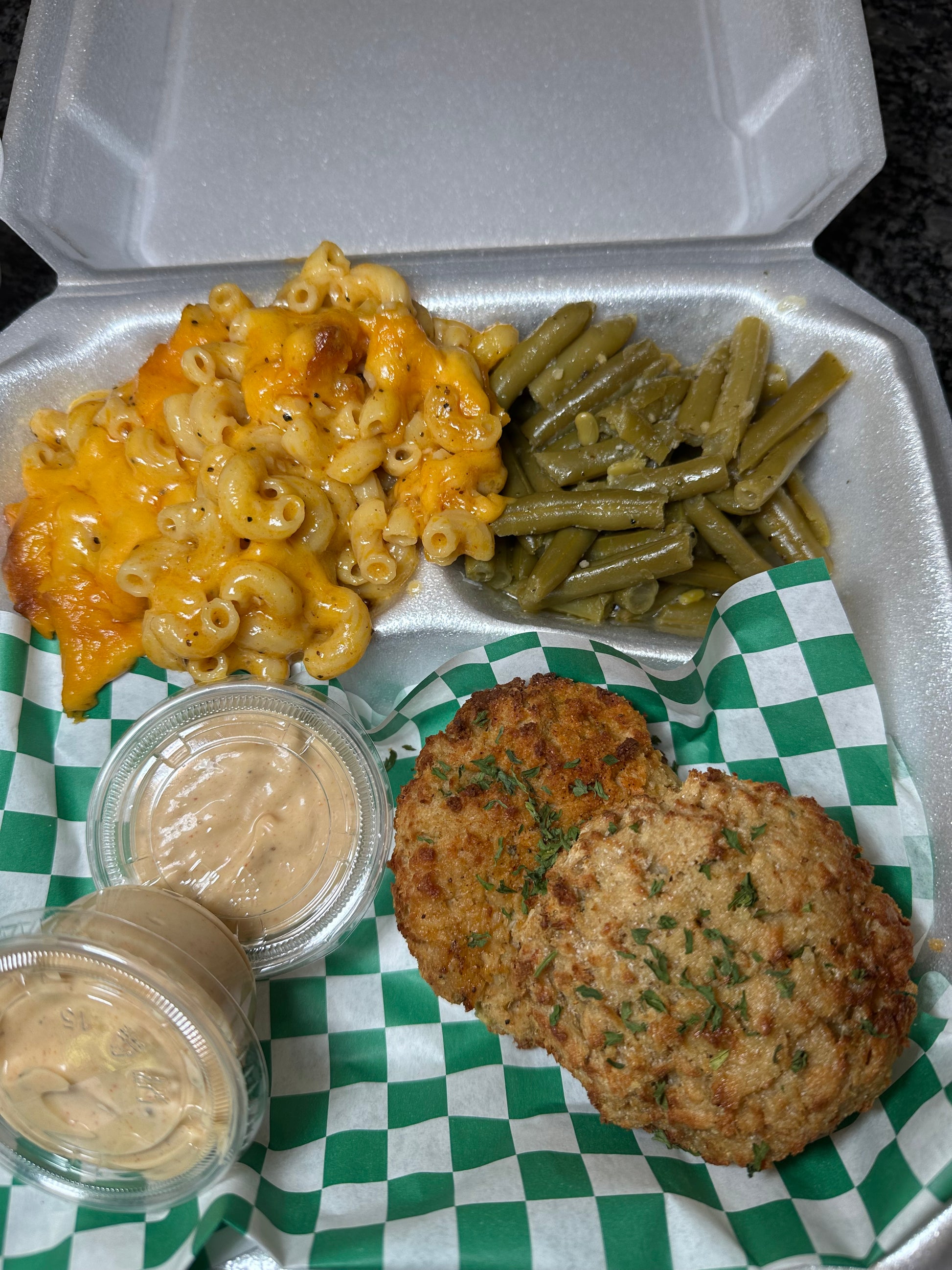 Vegan Crab Cakes, Mac & Cheese, Green Beans